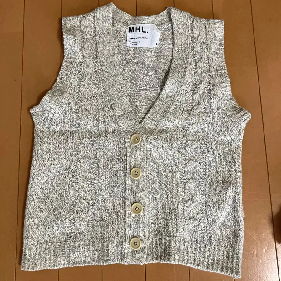케이블 짜임 디자인의 MHL. 슬리브리스 니트 베스트, 그레이 계열.
