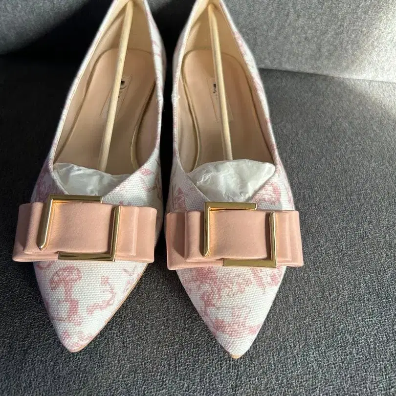핑크색 리본과 금장 장식이 특징인 스틸레토 플랫슈즈. 투르 드 주이 패턴으로 되어 있어 멋스럽습니다. - 브랜드: 다이애나 - 디자인: 투르 드 주이 패턴에 핑크색 리본과 금장 장식 - 스타일: 스틸레토 - 소재: 원단 (텍스타일) - 색상: 화이트, 핑크 방문해 주셔서 감사합니다. 사이즈 - 23.5cm