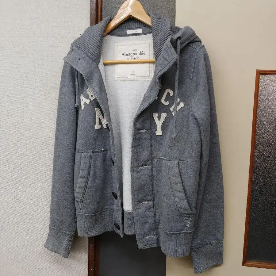 후드 부착 그레이 후드티, 단추식, 앞면 포켓 부착. - 브랜드: Abercrombie & Fitch - 사이즈: S - 색상: 그레이 - 디자인: 후드 부착, 단추식 - 버튼: Abercrombie & Fitch 로고 - 포켓: 앞면에 포켓 있음. 방문해 주셔서 감사합니다. 옷깃이 있고 두꺼운 원단으로 따뜻한 후드티입니다.