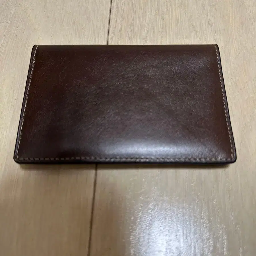고품질 브라운 가죽 명함지갑, 카드 슬롯 3개와 ID 창 포함.