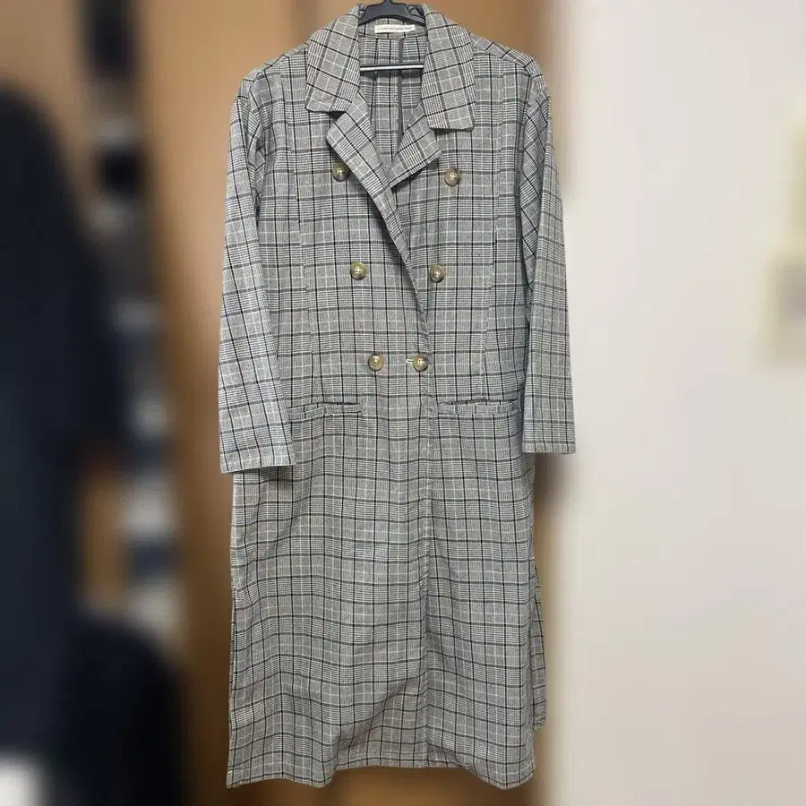 그레이 계열 체크 무늬 더블 브레스트 코트, 골드 컬러 버튼 포함. - 색상: 그레이 계열 체크 무늬 - 디자인: 더블 브레스트 - 버튼 색상: 골드 컬러 - 소매 스타일: 긴팔 - 기장: 미디 기장 방문해 주셔서 감사합니다. 사이즈 - FREE SIZE