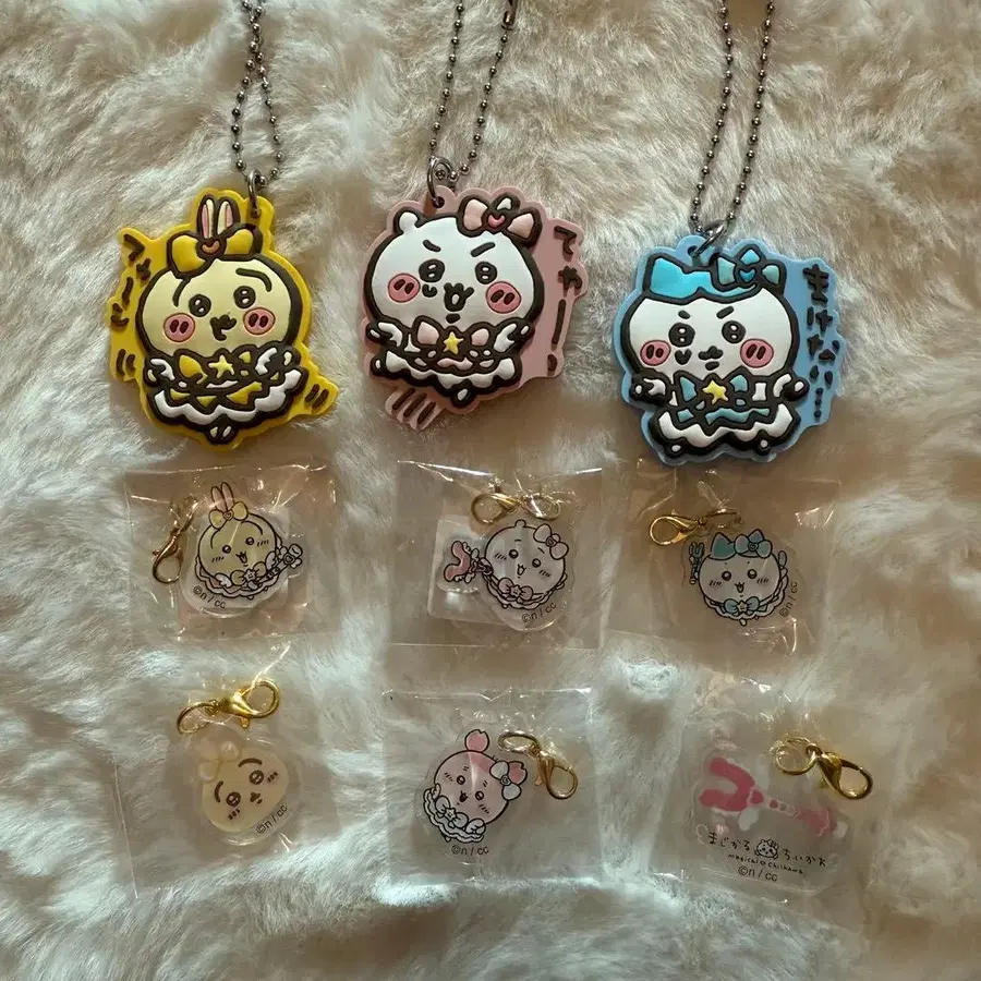 9개 세트입니다. 모두 미사용이지만 위 3개는 봉투에서 꺼내 보관했습니다. 치이카와(먼작귀), 하치와레, 토끼, 헌책방, 카니짱 아크릴 키링, 아크릴 참