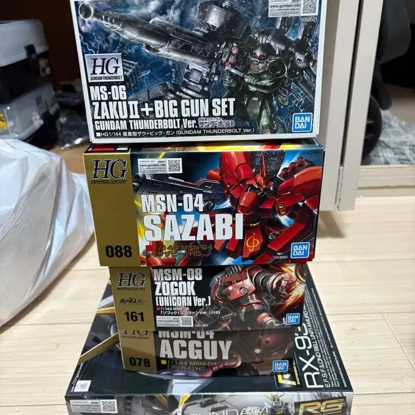 모두 미개봉 새상품입니다. RG ν건담 HG 양산형 자쿠 + 빅 건 HG 앗가이 HG 사자비 HG 조고크 의 5세트입니다. 낱개 판매 불가
