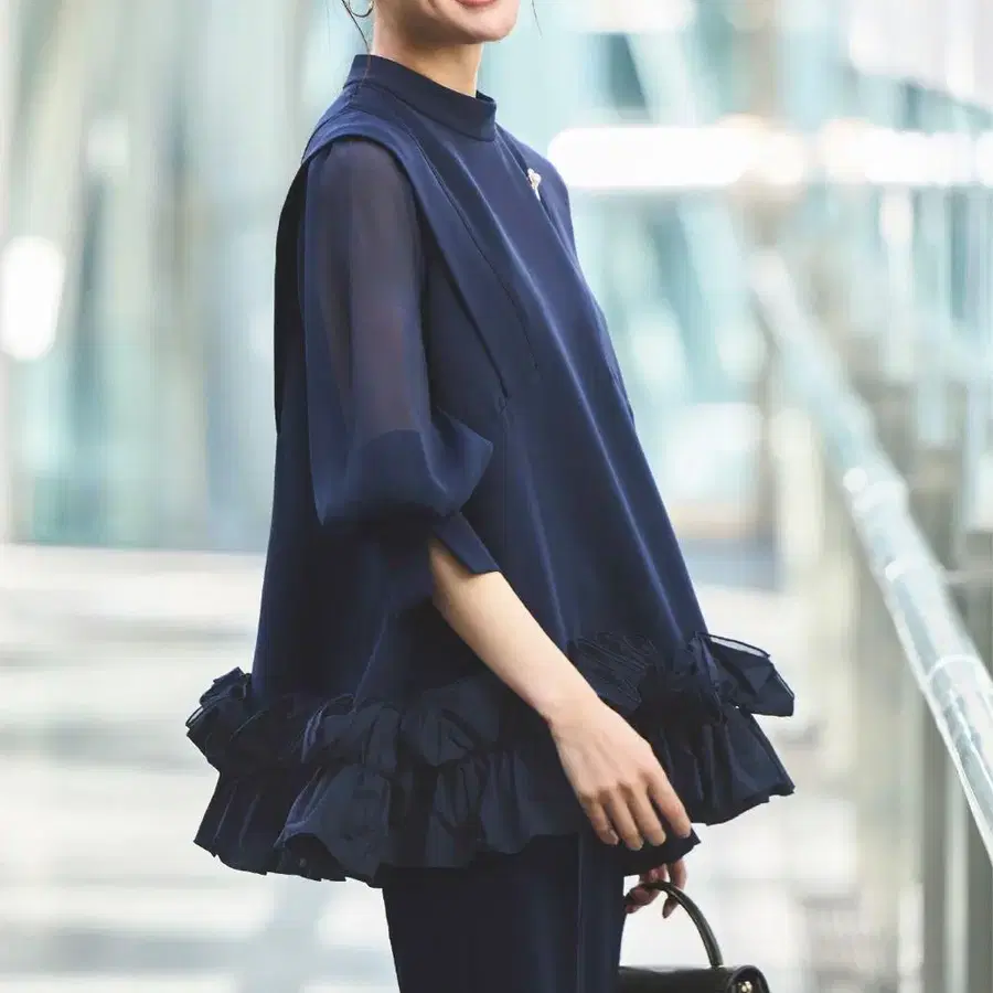 밑단의 프릴이 화려하며, 시어 소재의 소매가 고급스러운 인상을 선사합니다.