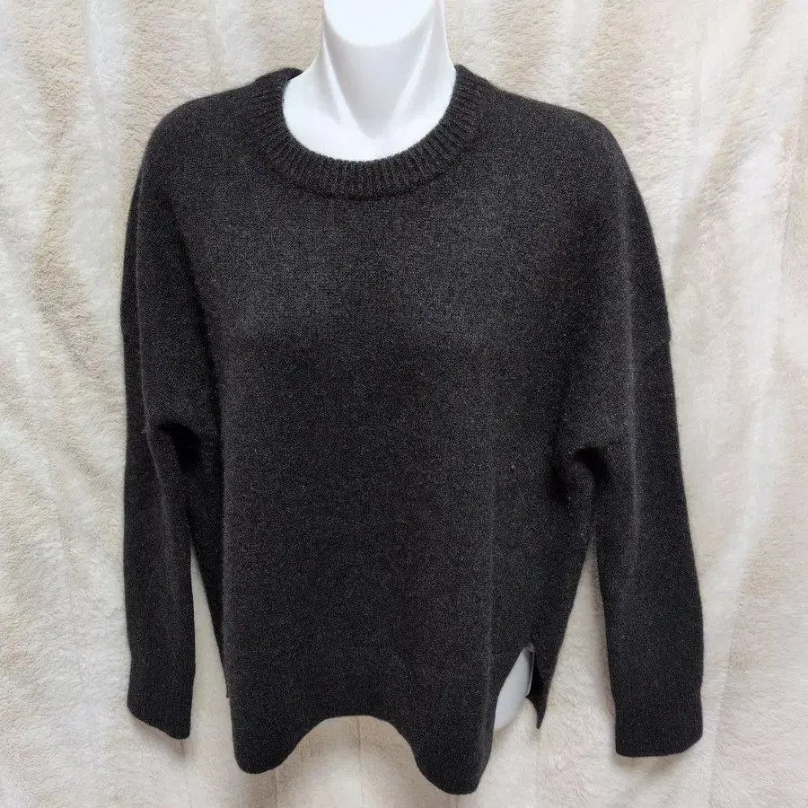 다크 그레이 색상의 크루넥 스웨터, 사이드 슬릿으로 스타일리시함.