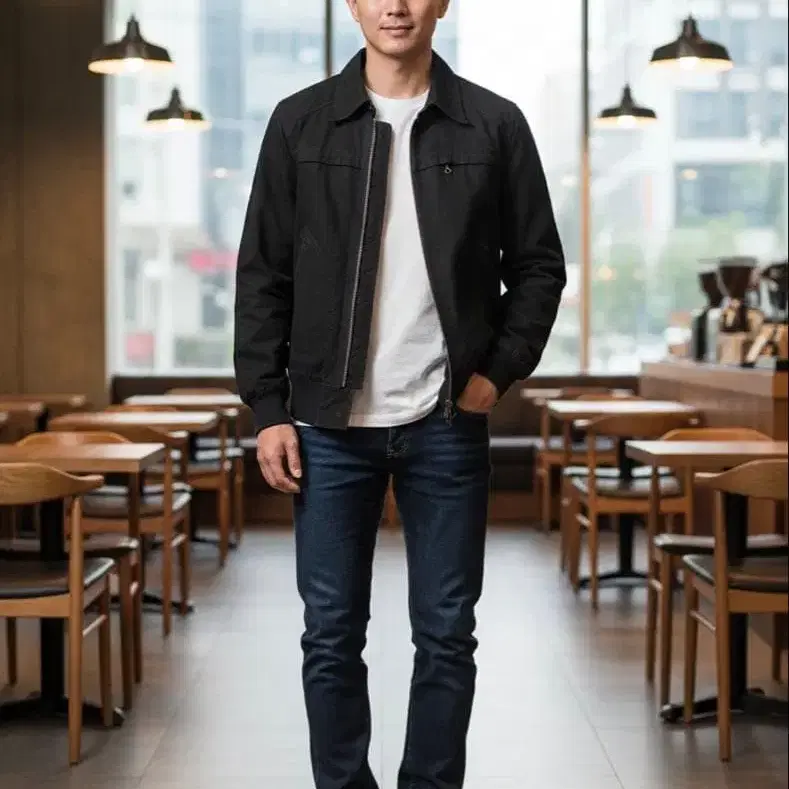 자동 번역되었어요. 원문보기지퍼가 달린 블랙 캐주얼 자켓, 포켓 2개로 기능적입니다.