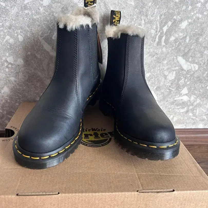 블랙 가죽 사이드 고어 부츠, 퍼 안감으로 쾌적한 착용감. - 브랜드: Dr. Martens - 색상: 블랙 - 스타일: 사이드 고어 부츠 - 소재: 가죽 - 안감: 퍼 - 밑창: 러버 - 특징: 에어쿠션 밑창 방문해 주셔서 감사합니다. 사이즈 - 23cm
