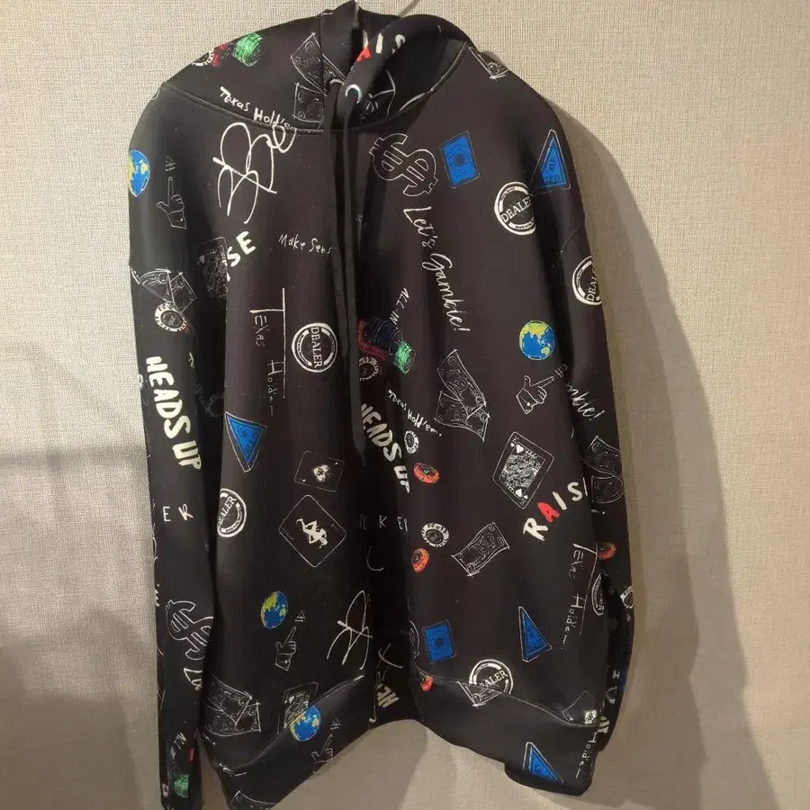 - 디자인: 다양한 로고와 그래픽이 새겨진 블랙 컬러 후드티