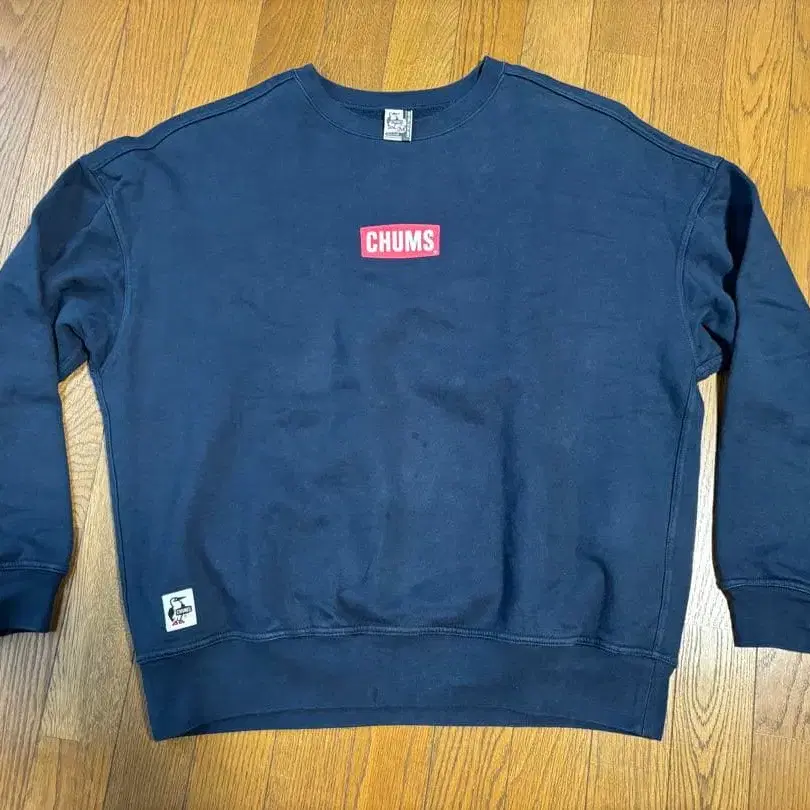 네이비 CHUMS 크루넥 트레이닝복, 오버 사이즈, 로고 디자인이 특징입니다.
