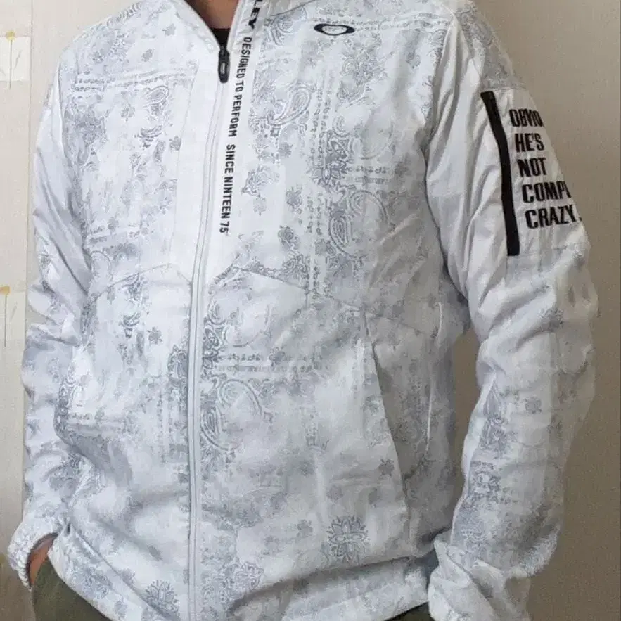골프 남성용, 화이트 자켓 착용자는 169cm 72kg으로, 딱 좋은 느낌입니다. - 브랜드: Oakley - 색상: 화이트 - 디자인: 반다나 패턴 - 특징: 지퍼 포함 방문해 주셔서 감사합니다.