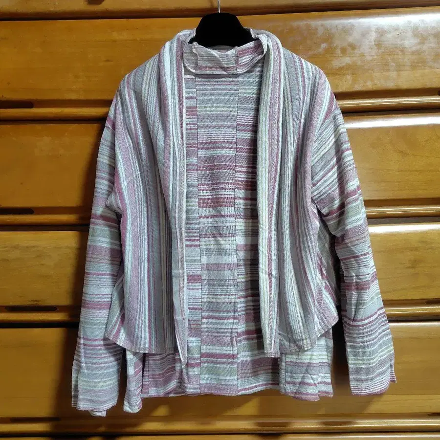 스트라이프 디자인의 경량 가디건과 하이넥 상의 앙상블 - 색상: 스트라이프 ( 핑크, 그레이, 화이트 ) - 사이즈: [상의] 평평하게 놓았을 때 가슴 너비 - 약 56cm, 길이 - 약 64cm [가디건] 평평하게 놓았을 때 가슴 너비 - 약 61cm, 길이 - 약 63cm - 소재: 경량, 부드러운 원단 - 스타일: 캐주얼, 릴랙스핏 방문해 주셔서 감사합니다. 상의에 1곳, 보관에 따른 얼룩이 있지만 크게 눈에 띄지 않습니다(*ˊ˘ˋ*) 선물 받은 것이라 자세한 내용은 모릅니다.