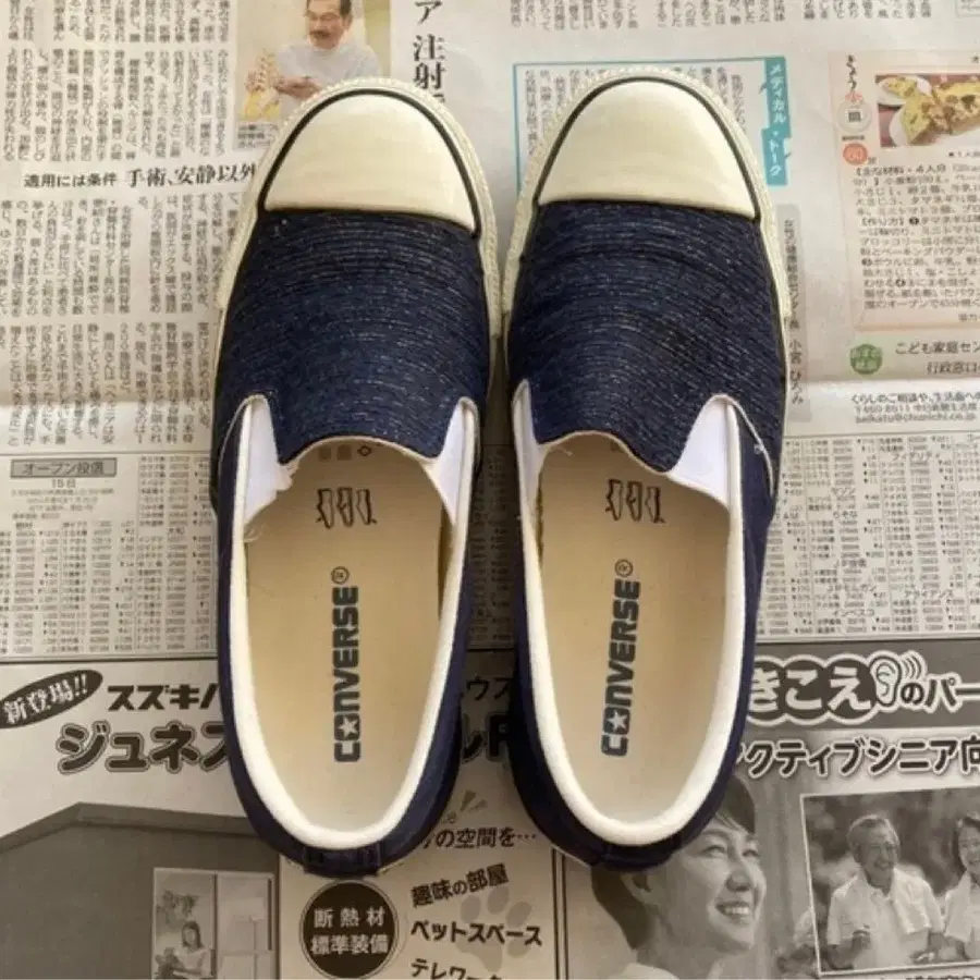 네이비 색상의 캔버스 소재로 된 슬립온 디자인의 CONVERSE ALL STAR 스니커즈입니다.