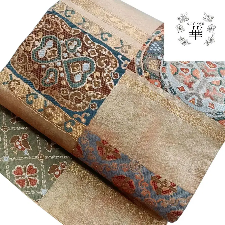 1070 화 후쿠로 오비 순수 실크 격자 금 새