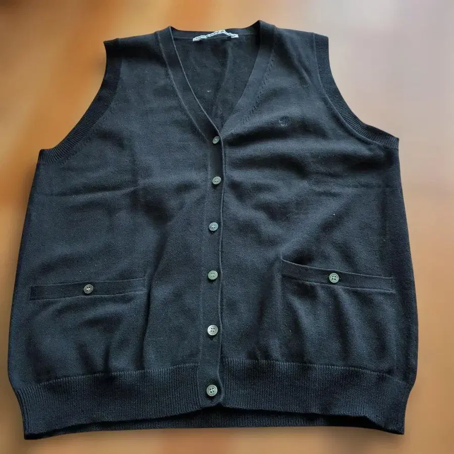 은은하게 포인트가 들어간 코튼 100% 베스트입니다. 버튼에도 로고가 있습니다. 사이즈 L 가슴 너비 48cm, 기장 58cm 잘 부탁드립니다.