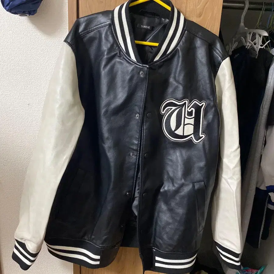 가죽 소재의 바시티 자켓, U 자수가 들어간 스타일리시한 디자인. - 브랜드: SUREVE - 색상: 블랙/화이트 - 디자인: 가죽/바시티 자켓 - 자수: U 로고 방문해 주셔서 감사합니다. 사이즈 - M