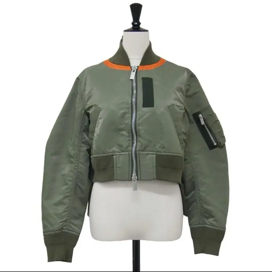 자동 번역되었어요. 원문보기올리브 그린의 MA-1 스타일 자켓, 크롭 기장에 오렌지 색 옷깃이 특징.