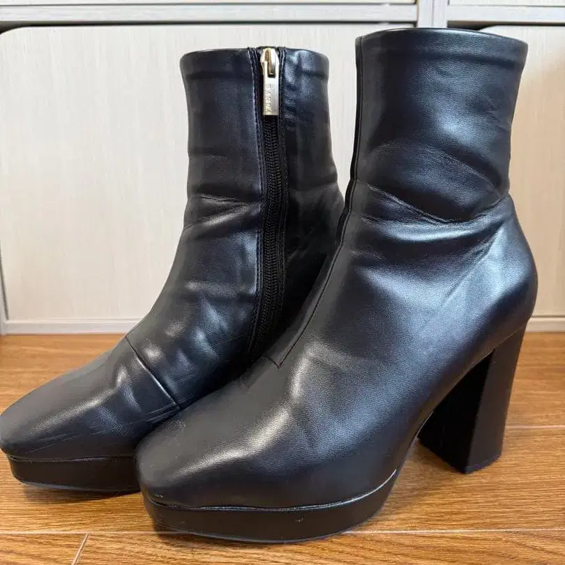 합성 피혁 소재의 하이힐 부츠로, 안쪽 지퍼가 달린 스타일리시한 디자인입니다.