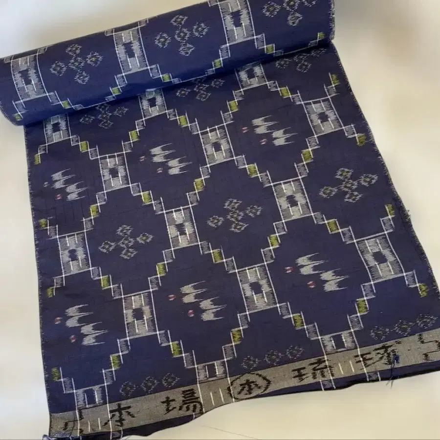 류큐 특유의 색감으로 고마이 패턴 (絣 매듭) 안에 제비와 동전 모양이 짜여 들어간 絣 패턴입니다.