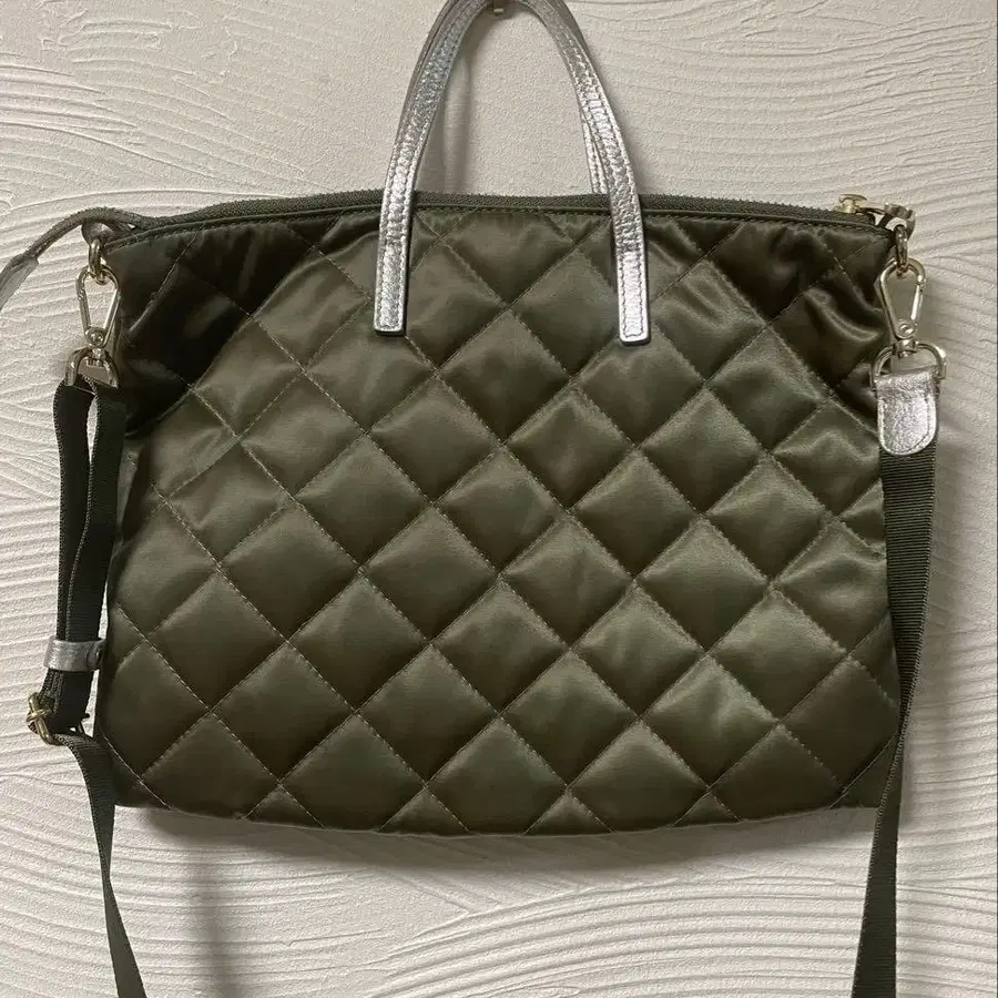 russet의 튼튼한 CLOUD NYLON 올리브 그린 새틴 퀼트 숄더백입니다.