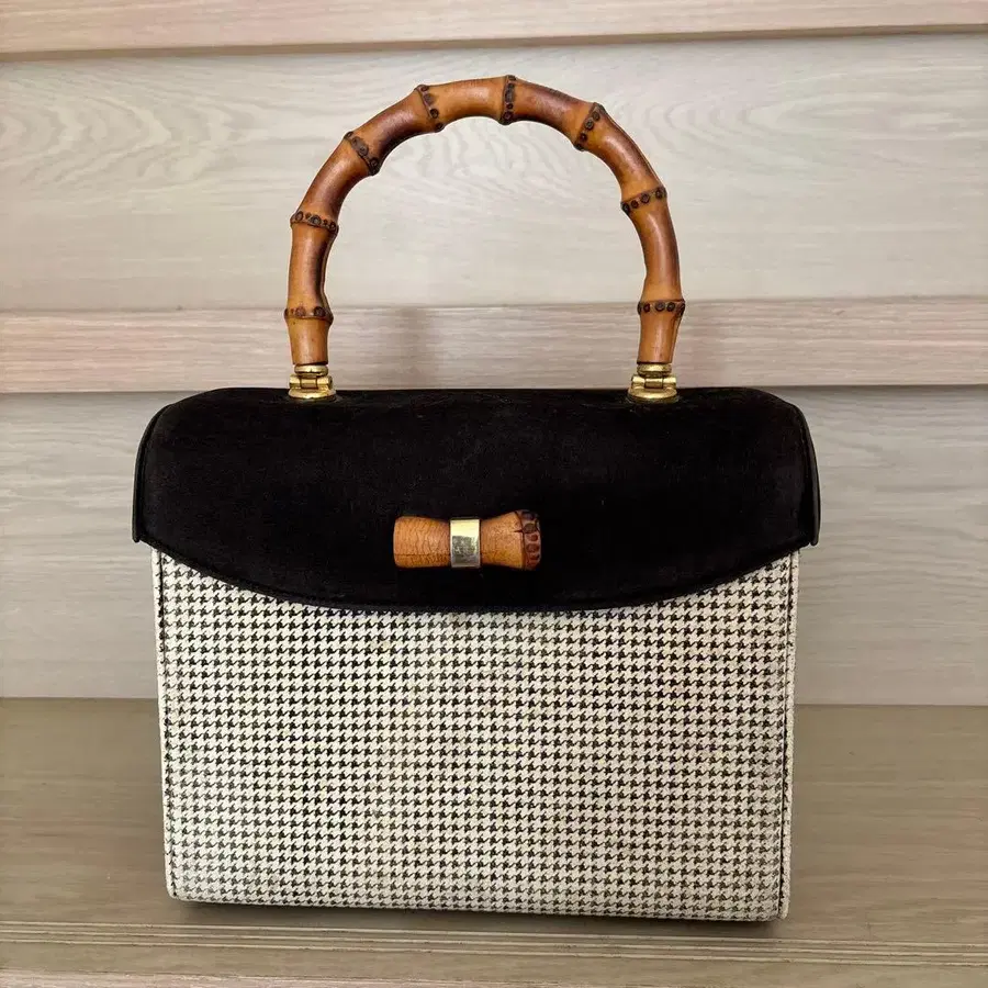 하운드 투스 패턴의 박스형 핸드백, 대나무 핸들 포함. 중고품이며 자택 보관 제품임을 이해하신 후, 검토 및 구매 부탁드립니다. - 디자인: 하운드 투스 패턴과 스웨이드의 조합 - 핸들: 대나무 핸들 - 색상: 블랙과 화이트의 콤비네이션 - 소재: 스웨이드 및 합성 소재 - 모양: 박스형 방문해 주셔서 감사합니다.