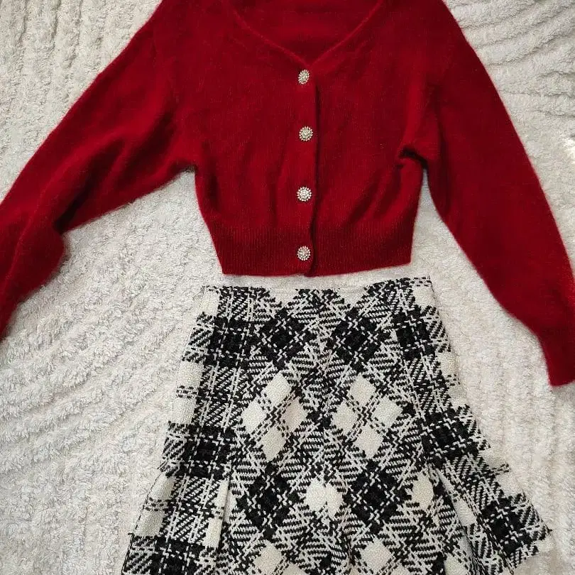 SNIDEL 레드 크롭 가디건과 체크 무늬 스커트 세트