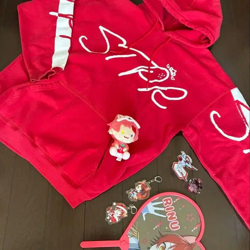 すとぷり 리이누 Rinu 캐릭터의 빨간색 후디와 관련 굿즈 세트. 후드티 아크릴 스탠드 부채 키링