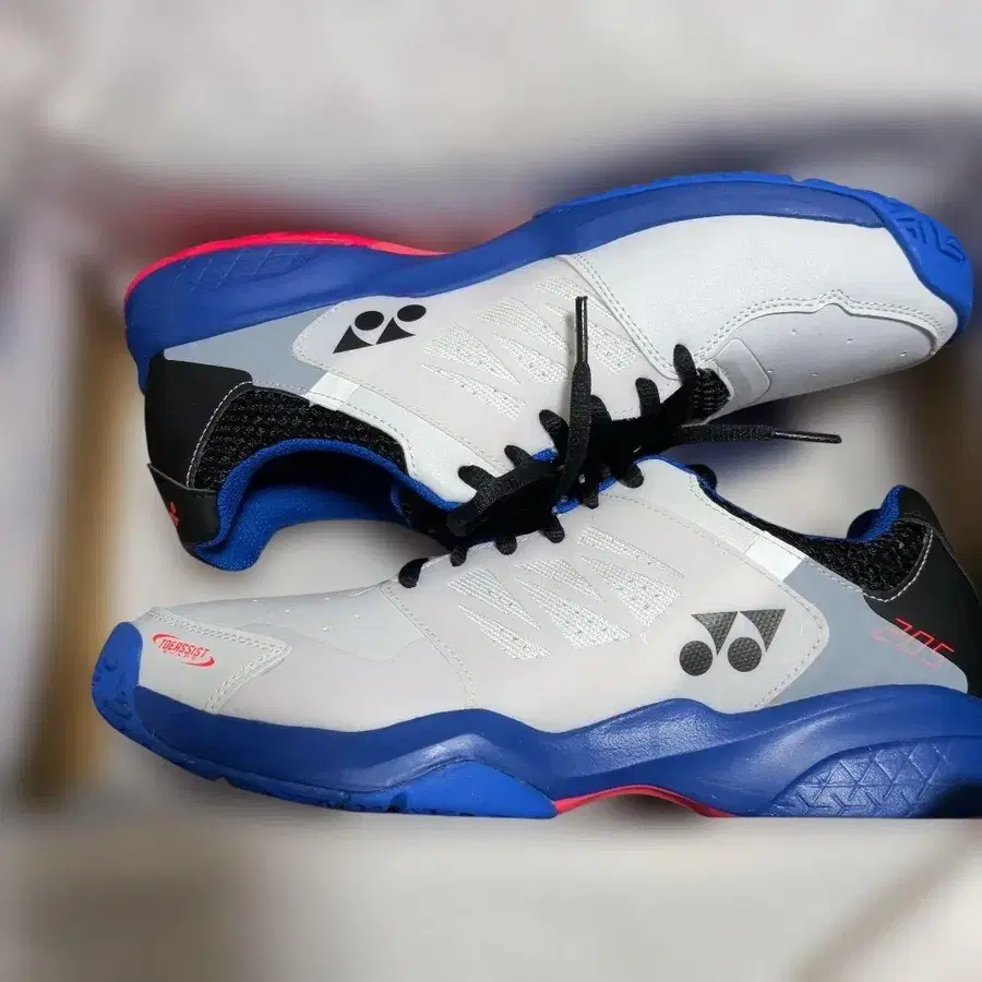 요넥스 테니스화, 미사용 새상품입니다. - 브랜드: YONEX - 모델명: SHT205 - 색상: 화이트/블루/블랙/레드 - 제조국: 인도네시아 - 특징: 착지 충격을 흡수하는 파워크ッション. 방문해 주셔서 감사합니다.