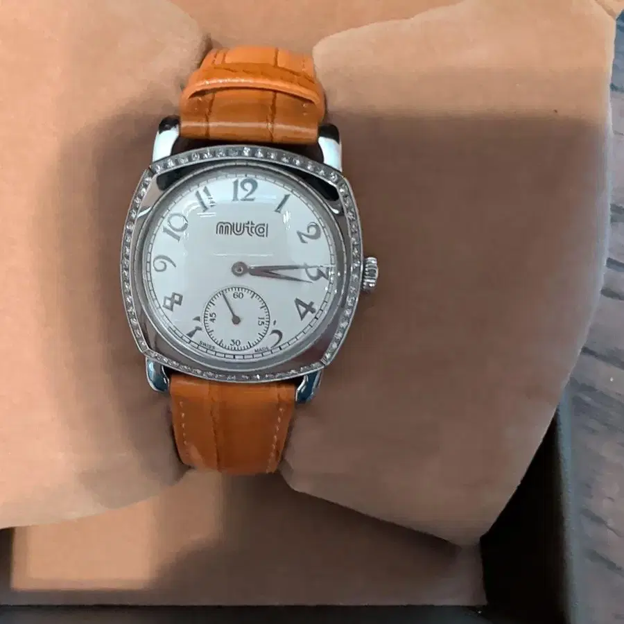 브라운 벨트와 실버 다이얼에 다이아몬드풍 장식이 된 쿼츠 손목시계. - 브랜드: muta - 색상: 밝은 브라운 - 다이얼 색상: 실버 - 스트랩 소재: 가죽 - 특징: 다이아몬드풍 장식 - 부속품: 보증서 - 스트랩 색상: 오렌지 방문해 주셔서 감사합니다.