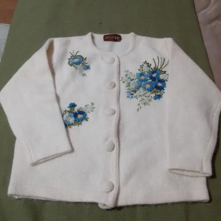 아이보리 울 소재에 파란 꽃 자수가 놓인 긴팔 가디건.