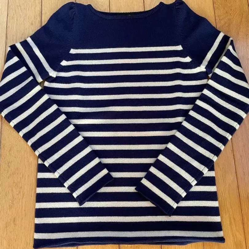 ♦︎ 네이비와 화이트 스트라이프 디자인의 퍼프 슬리브 스웨터, 사이즈 2. ♦︎ 캐시미어 혼방으로 고급스러운 촉감이며, 매우 따뜻한 니트입니다. - 브랜드: Drawer - 색상: 네이비/화이트 스트라이프 - 사이즈: 2 - 스타일: 긴팔 스웨터