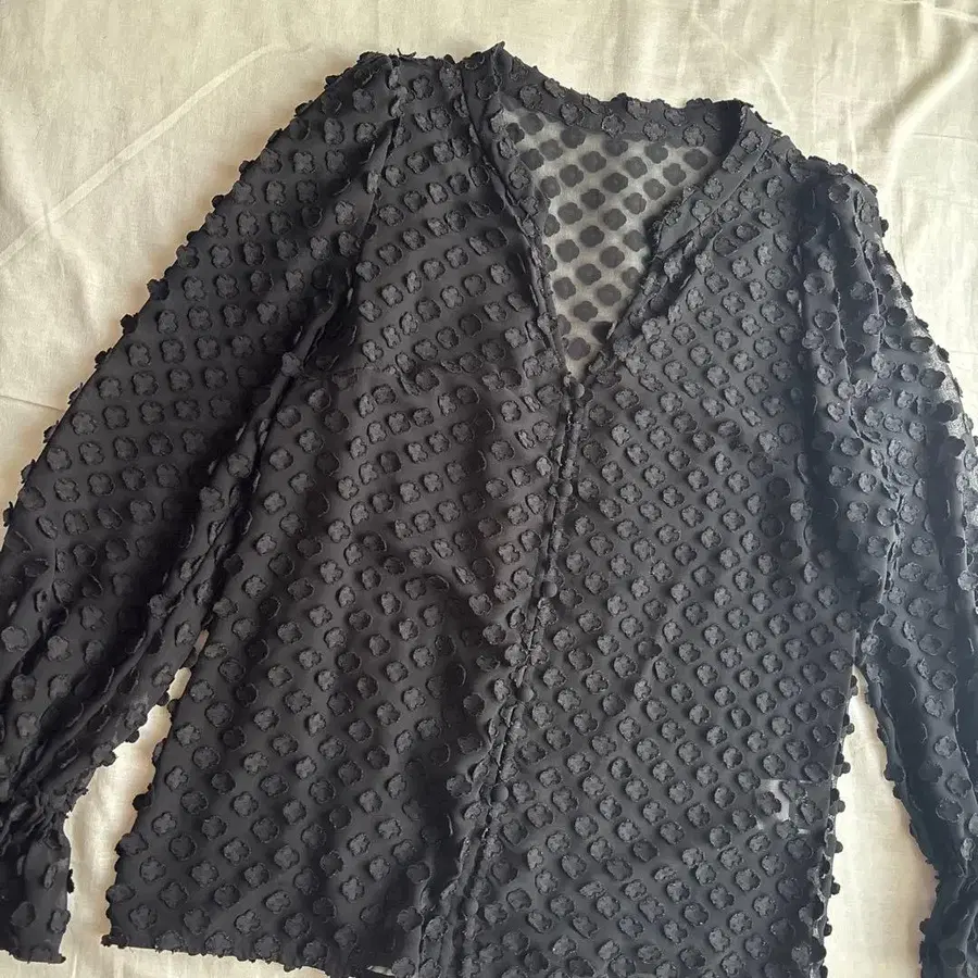 시스루 도트 무늬가 특징인 블랙 긴팔 블라우스. - 색상: 블랙 - 소재: 시스루 원단 - 디자인: 도트 무늬 - 브랜드: GRACE CONTINENTAL 방문해 주셔서 감사합니다.