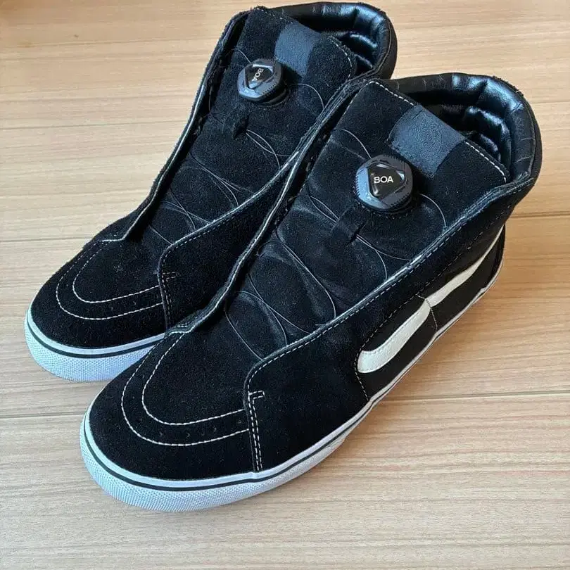 정가 23100엔 AlexanderLeeChang x VANS BOA TOP SK8 HI 사이즈 29cm 반스의 대명사인 SK8 HI (스케이트 하이)를 베이스로, 신발끈을 사용하지 않는 새로운 핏 시스템으로 주목받는 Boa 시스템을 채용했습니다. 또한 콜라보에서는 Boa 시스템을 탑재하기 위해 슈텅을 도톰하게 개량하여 핏감도 대폭 향상되었습니다. 표면은 깨끗하지만, 안쪽 뒤꿈치 주변의 원단 노후화가 진행되어 벗겨짐이 있습니다. 문지르면 벗겨짐이 진행되는 상태입니다. 블랙 삭스로 맞춰 신으시면 얼룩 부착은 눈에 띄지 않을 것이라 생각합니다만, 컨디션을 고려하여 검토해 주십시오.