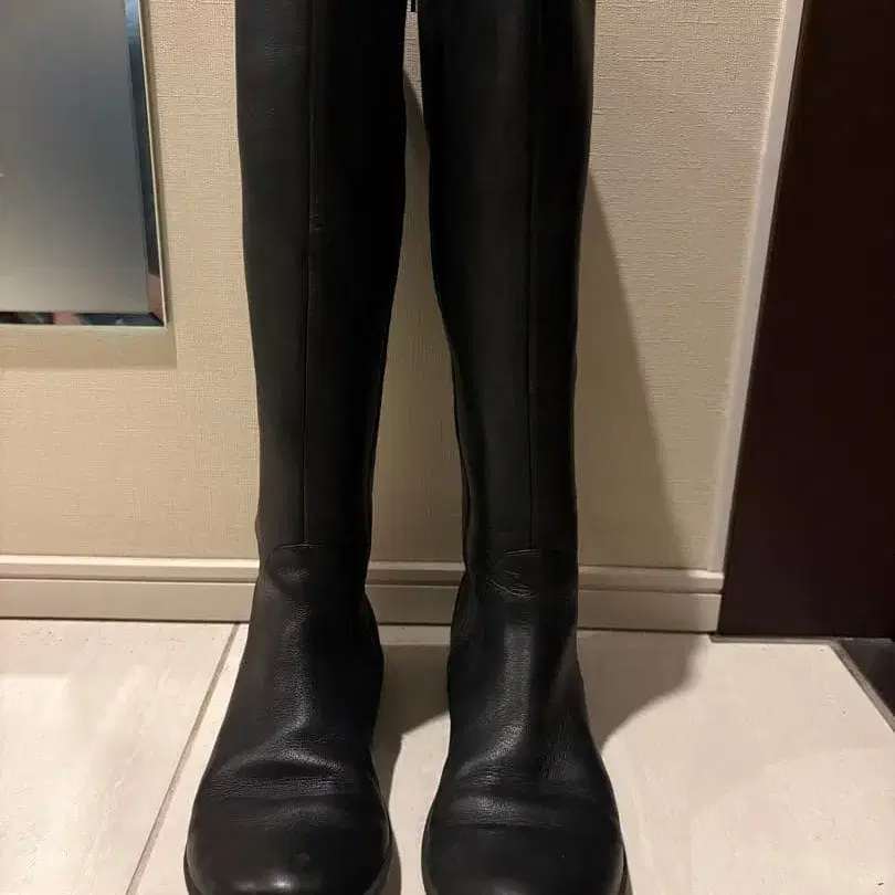 캠퍼의 사이드 지퍼가 달린 블랙 가죽 롱 부츠입니다.