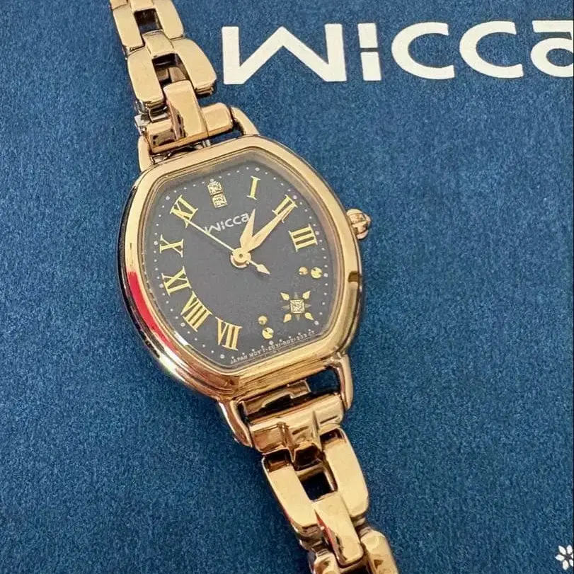 골드와 네이비 색상의 캐주얼 디자인, 교체용 벨트가 포함된 Wicca 시계입니다.