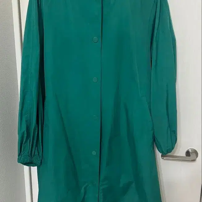 후드 부착 그린 코트입니다.