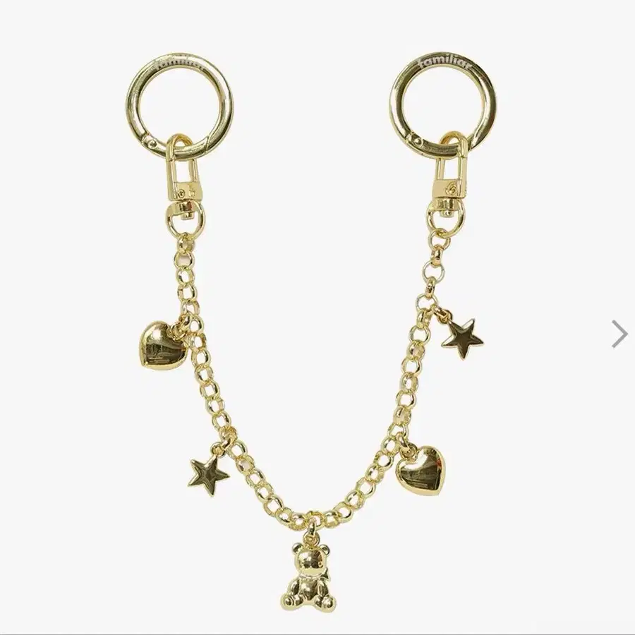 곰, 하트, 별 오너먼트를 장식한 골드 컬러의 참입니다. 양쪽 끝에는 탈부착 가능한 카라비너 링이 달려 있어 가방 등에 달아 사용할 수 있습니다. 양쪽 끝 각각의 링을 사용하거나, 한쪽에만 모아 달거나 하는 등 자유로운 어레인지를 즐길 수 있습니다.