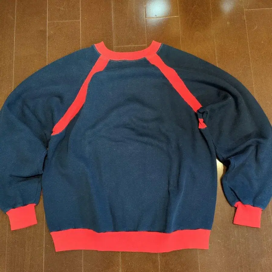 구제 의류의 네이비와 레드 색상 래글런 슬리브 맨투맨입니다.