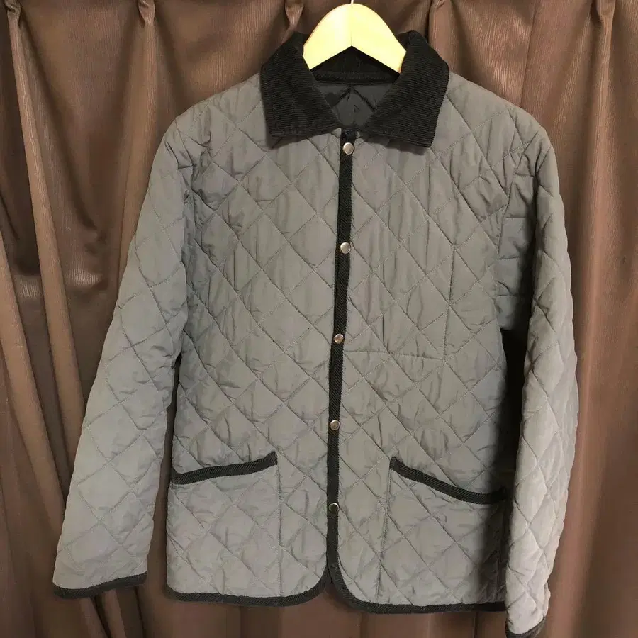 그레이 색상의 코듀로이 카라 부착 퀼팅 자켓, MEDIUM 사이즈.