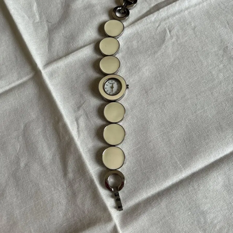 심플한 디자인의 화이트 아날로그 시계, 팔찌 타입으로 사용하기 편리합니다.