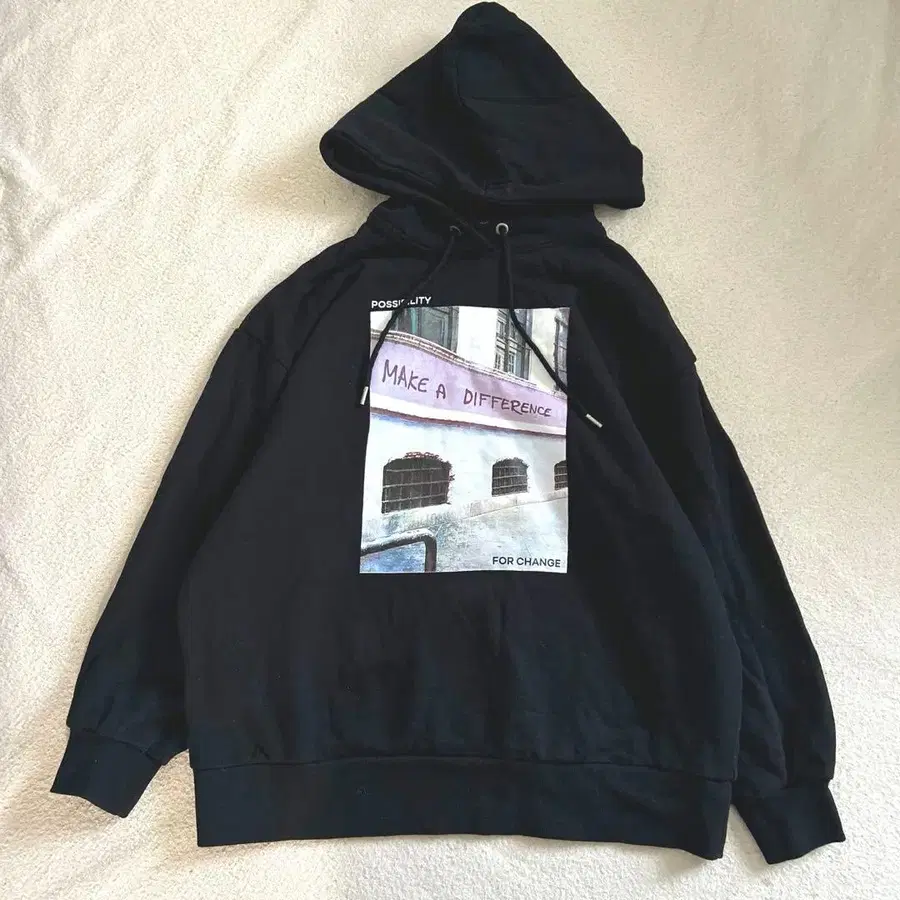 그래픽 프린트가 특징인 블랙 후드티. 속기모로 따뜻해요 ♡ 오버 사이즈로 넉넉해요 ♡ 눈에 띄는 얼룩은 없습니다.
