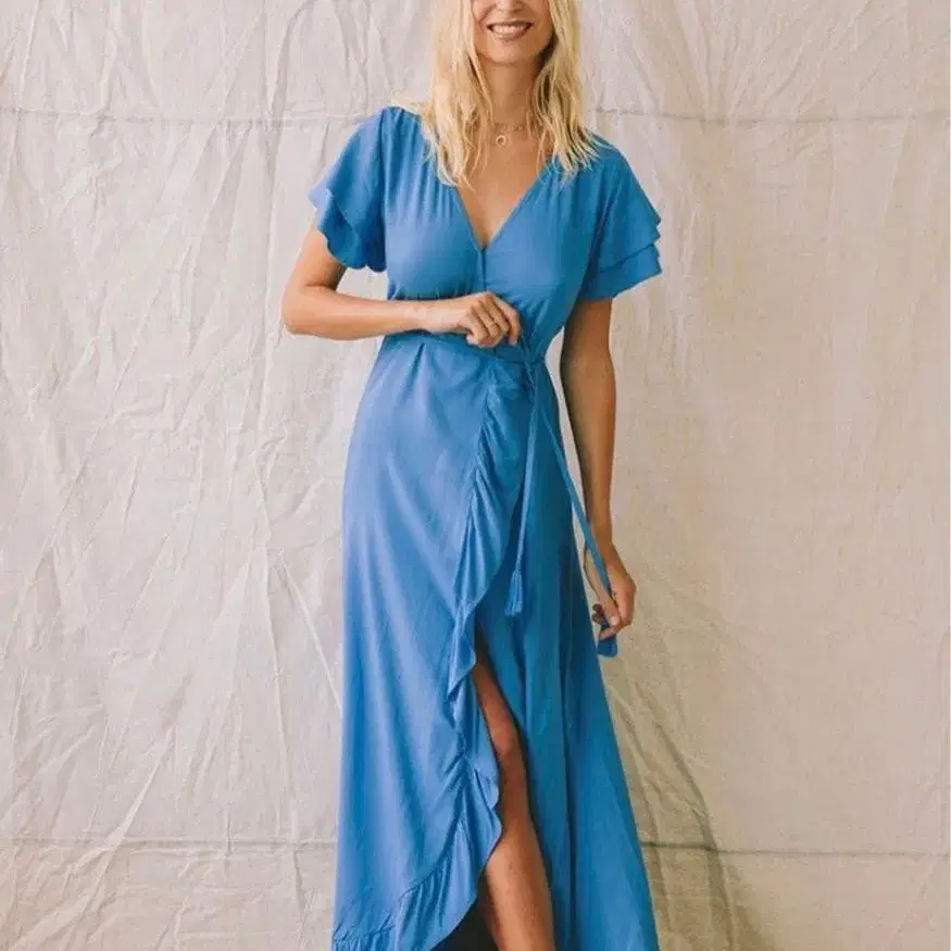 파란색 랩 스타일 프릴 소매 원피스. 미사용 새상품 집에서 시착만 했습니다. XS 사이즈이지만, 일본에서는 M 사이즈에 상당할 것으로 생각됩니다. - 브랜드: Rove Byron Bay (호주 리조트 의류 브랜드) - 색상: 파랑 - 디자인: 랩 스타일 - 소매 스타일: 프릴 소매 - 스커트 스타일: 플레어 스커트 방문해 주셔서 감사합니다. 색상 - 블루 계열