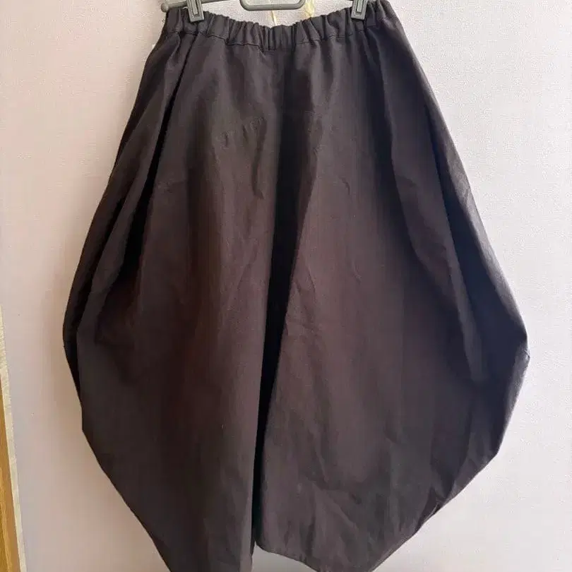 자동 번역되었어요. 원문보기다크 브라운, 약간의 퍼플이 감도는 벌룬 실루엣 스커트, 코튼과 린넨 혼방 소재로 쾌적한 착용감.