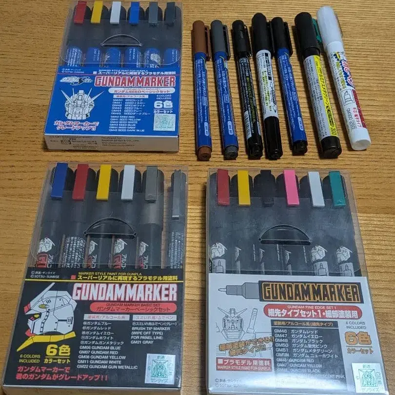 건담 프라모델 제작에 사용했던 중고 건담 마커입니다. 2~3체 제작 후 1년 이상 방치했던 것입니다. 부분 도색에만 사용했기 때문에 대부분은 아직 사용할 수 있다고 생각합니다.