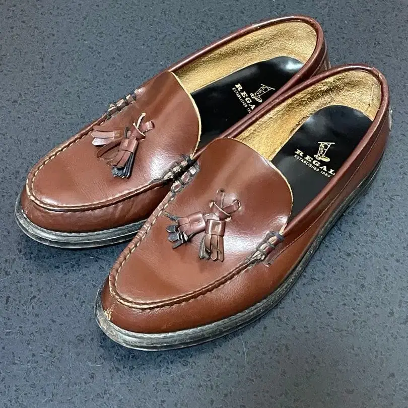 태슬 장식의 브라운 로퍼, 러버 솔로 쾌적한 착용감. - 브랜드: REGAL - 색상: 브라운 - 스타일: 로퍼 - 디자인: 태슬 장식 - 밑창: 러버 솔 방문해 주셔서 감사합니다. 사이즈 - 24cm