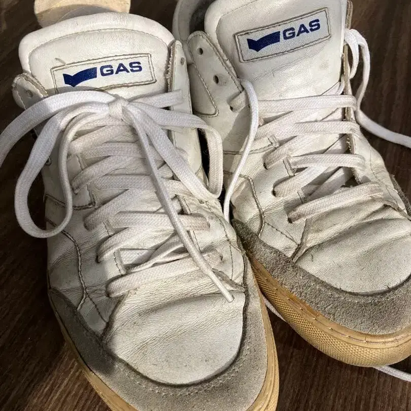 화이트 가죽 하이컷 스니커즈. - 브랜드: GAS - 색상: 화이트 - 소재: 가죽 - 스타일: 하이컷 스니커즈 - 밑창: 러버 솔 방문해 주셔서 감사합니다. 얼룩, 찢김, 냄새 등 - 있음