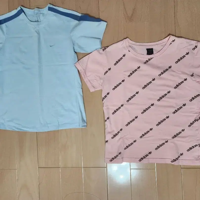 핑크 로고 프린트 T셔츠와 스카이블루 스트라이프 T셔츠 세트.