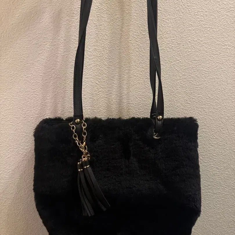 블랙의 인조 모피 소재로, 안쪽에 지퍼 포켓과 여러 개의 컴파트먼트를 갖춘 토트백입니다.