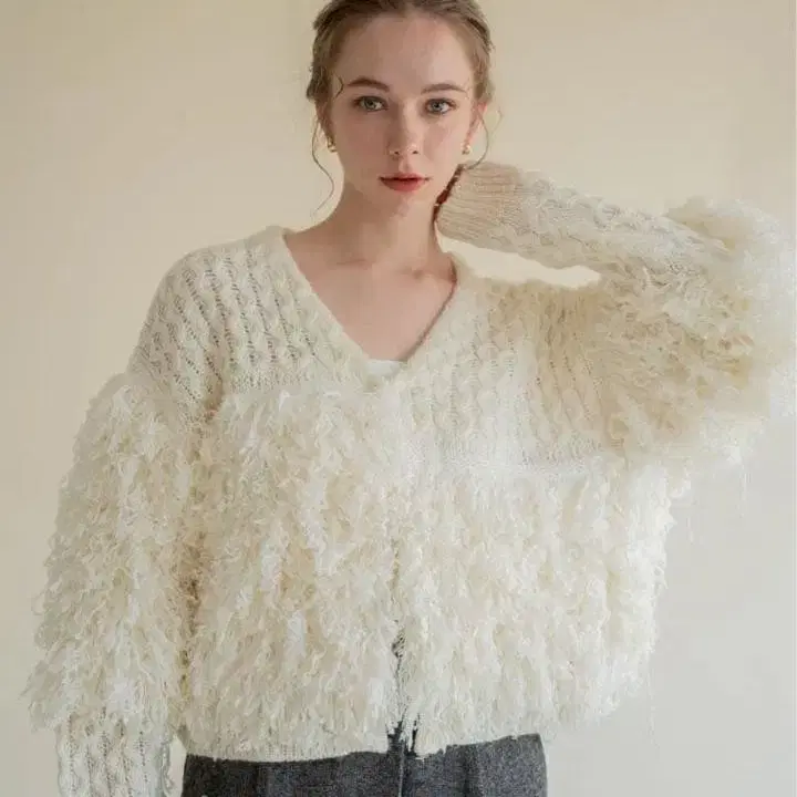 색상: 화이트 상태: 택 포함 미사용 새상품 포근한 루프얀이 시선을 사로잡는, 표정이 풍부한 니트 가디건입니다. 짜임을 절개하여 입체적인 실루엣으로 완성한 아이템입니다. 부드럽고 공기를 머금은 듯한 볼륨감이 있으면서도 착용감은 가볍습니다. 적당히 여유 있는 사이즈감이 신체를 감싸주며, 여성스러운 내추럴함을 연출합니다. 루프와 섬세한 짜임 무늬를 조합하여 전체적인 균형감에 깊이와 표정을 더했습니다.
