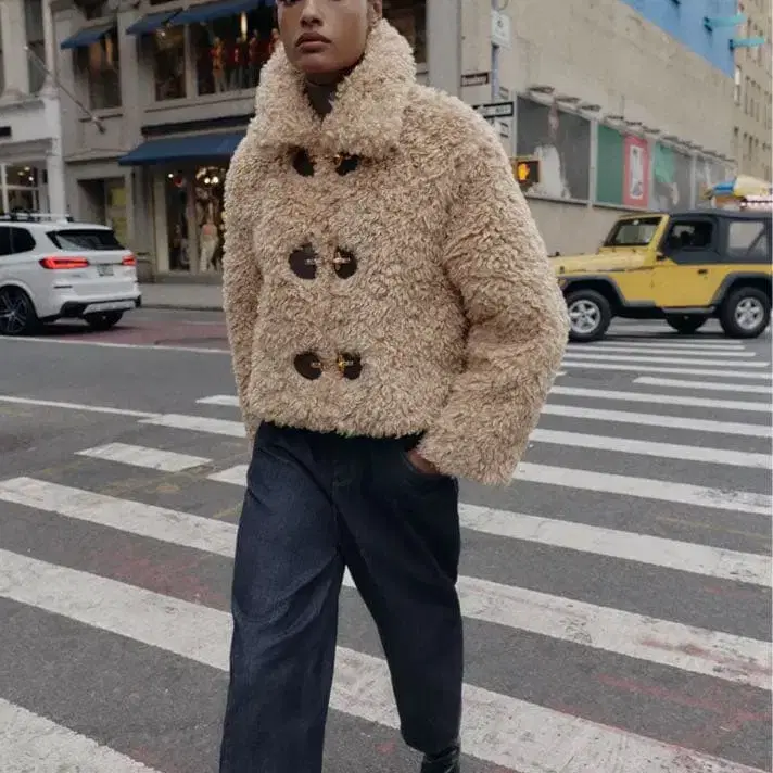 토글 버튼 인조 모피 자켓 베이지 보아 자켓