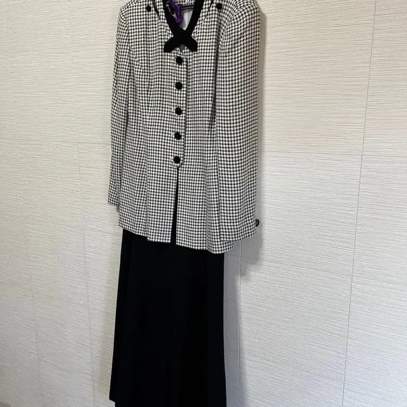 화이트와 블랙 체크 무늬 수트, 크로스 디자인의 옷깃이 특징. - 색상: 화이트와 블랙 체크 무늬 - 스타일: 수트 포멀 - 소재: 불명이나, 탄탄한 원단 - 옷깃 디자인: 크로스 디자인의 블랙 옷깃 - 스커트 스타일: 롱 스커트 방문해 주셔서 감사합니다.